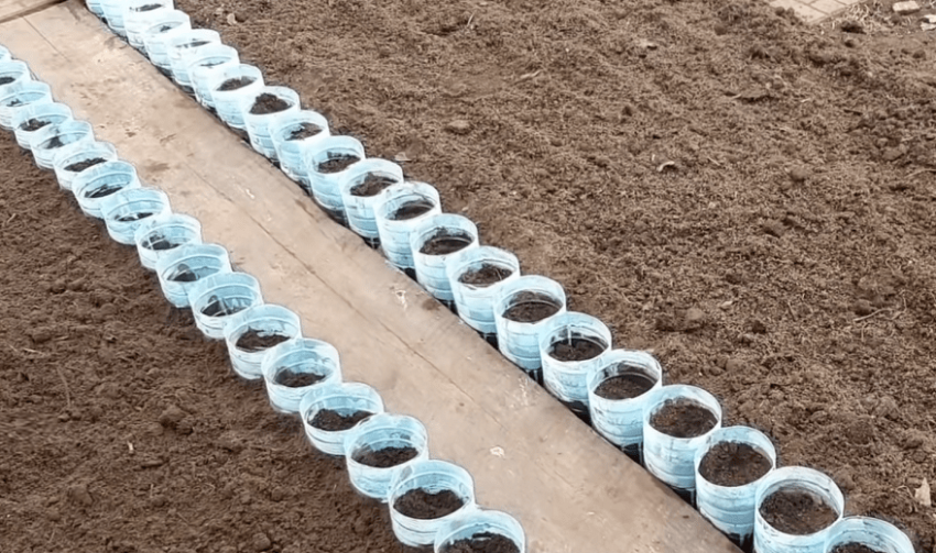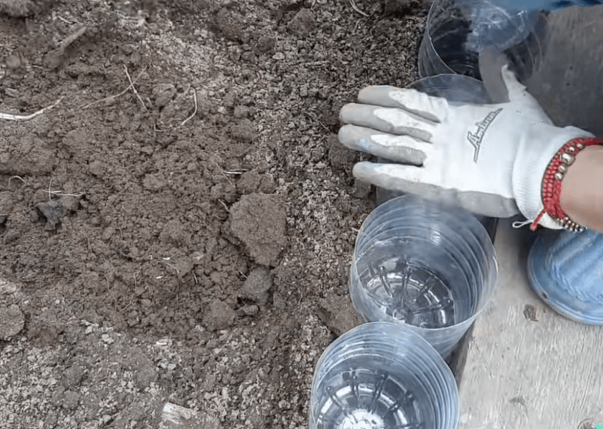 Для начала обрезаем достаточное количество бутылок одинакового диаметра по высоте. В каждой заготовке делаем по несколько боковых надрезов с небольшим отступом от дна. Это необходимо для того, чтобы излишки воды при поливе не скапливались внутри. Корням высаженных растений также будет куда прорости со временем.