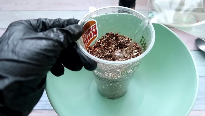 На дно стакана объемом 0,5 литра насыпьте мелкий керамзит. Наполните стакан на 2/3 вермикулитом. Для того чтобы черенок быстрее укоренился, субстрат следует обильно полить0,5 литрами воды с добавлением одной капли концентрированного натурального удобрения HB-101.