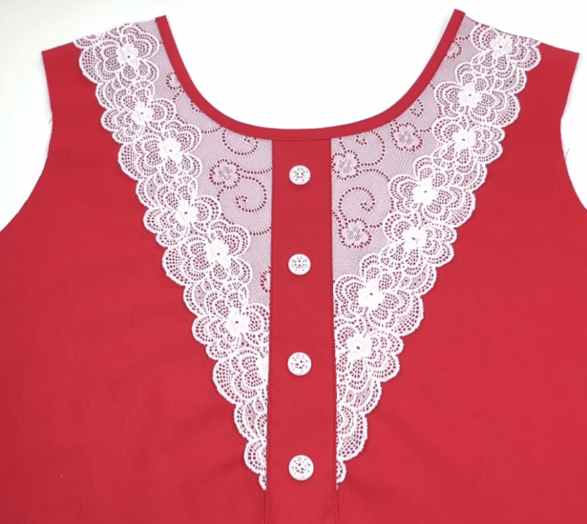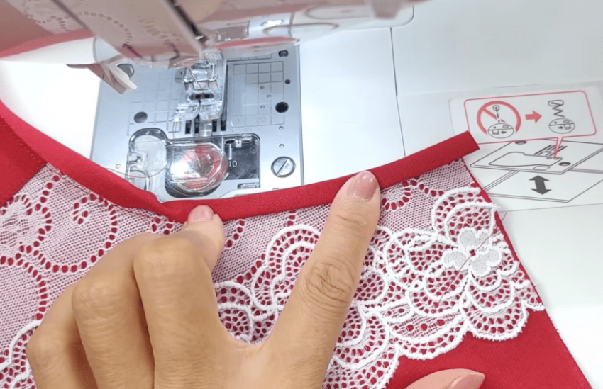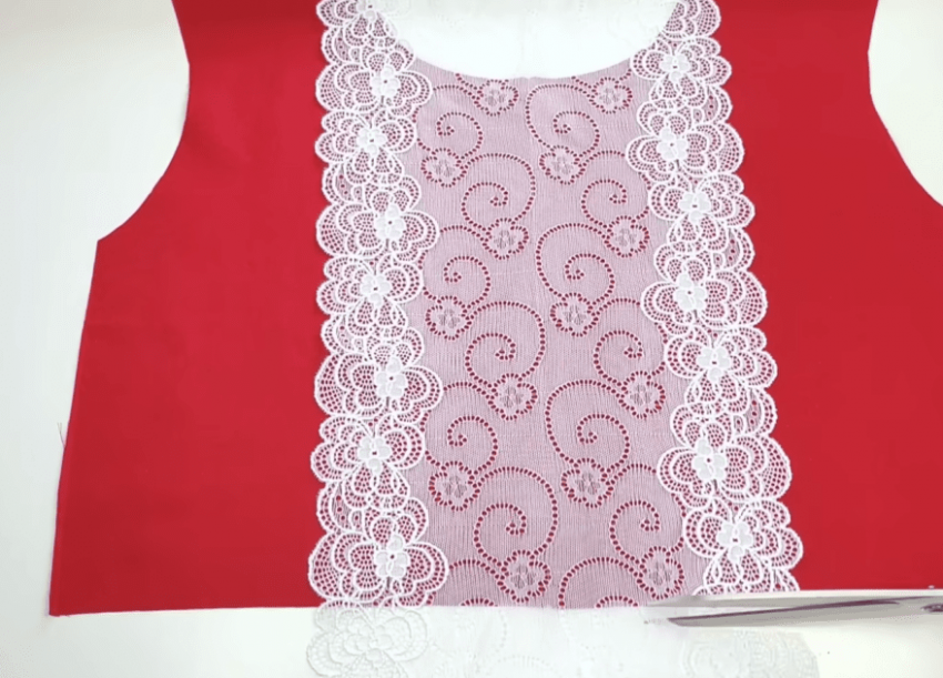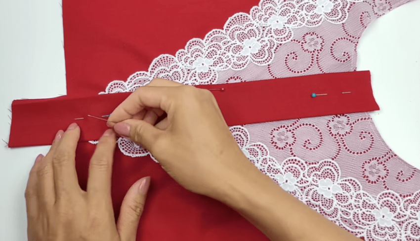 Переходим к области горловины. Дополнительно закрепляем кружево к ткани портновскими булавками, а затем прокладываем строчку с отступом от края в 0,5 см. После обрезаем излишки кружева.