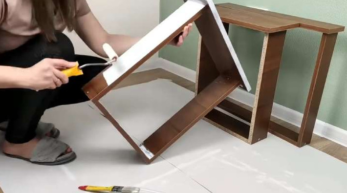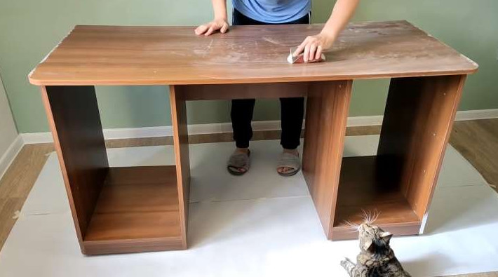 Из стола следует убрать ящики и направляющие. Поверхность, при наличии сколов, зашпатлевать и зачистить наждачной бумагой.