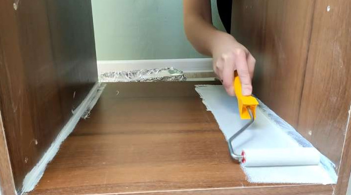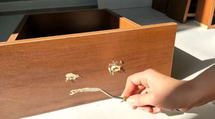 На ящиках снимаются ручки, а отверстия закрываются при помощи смеси из древесной пыли (муки) + столярного клея ПВА до густой консистенции. Затем ящики также следует отшлифовать и обезжирить.