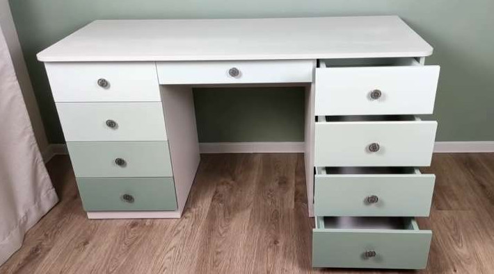 Если вам надоел старый письменный стол, который ещё и не вписывается в современный интерьер, то просто наберитесь смелости и перекрасьте его! В обновлённом виде столик будет восхитительно смотреться в любом интерьере. Рукодельница, живущая в горах/youtube Из стола следует убрать ящики и направляющие. Поверхность, при наличии сколов, зашпатлевать и зачистить наждачной бумагой. Рукодельница, живущая в горах/youtube После этого стол обезжиривается и красится в 2 слоя. Рукодельница, живущая в горах/youtube На ящиках снимаются ручки, а отверстия закрываются при помощи смеси из древесной пыли (муки) столярного клея ПВА до густой консистенции. Затем ящики также следует отшлифовать и обезжирить. Рукодельница, живущая в горах/youtube Красить можно просто белой краской. Рукодельница, живущая в горах/youtube Но чтобы получился красивый эффект, предлагаем вам красить градиентом. Верхние шкафчики — слегка зелёным, следующие два — уже темнее, и так далее. Рукодельница, живущая в горах/youtube Когда всё просохнет, следует установить на место направляющие и задние стенки. Рукодельница, живущая в горах/youtube А к ящикам прикрепить новые ручки. Посмотрите, насколько эффект градиента преобразил обыкновенный письменный стол! Рукодельница, живущая в горах/youtube