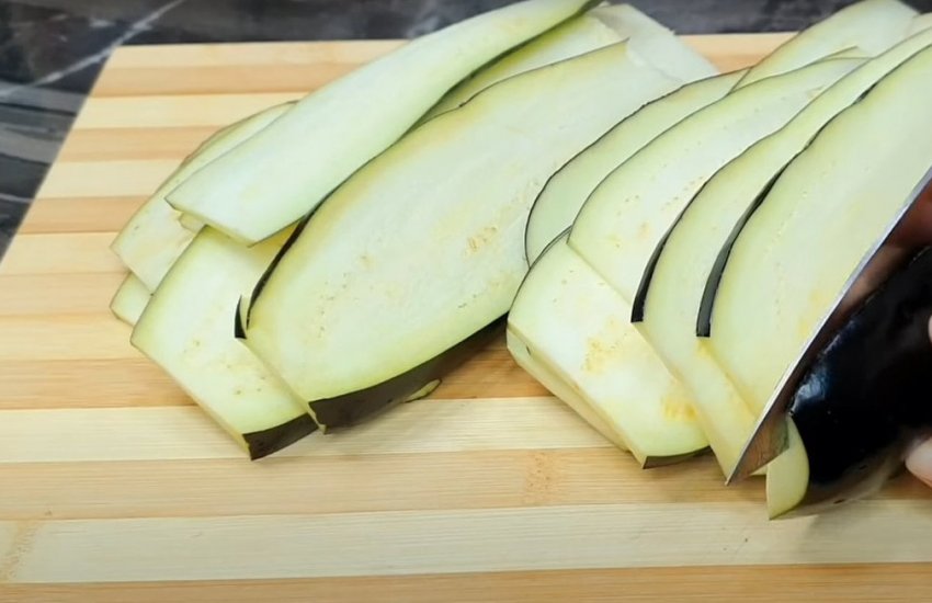 Нарежьте баклажаны на тонкие ломтики, присыпьте солью и оставьте на 20-30 минут.