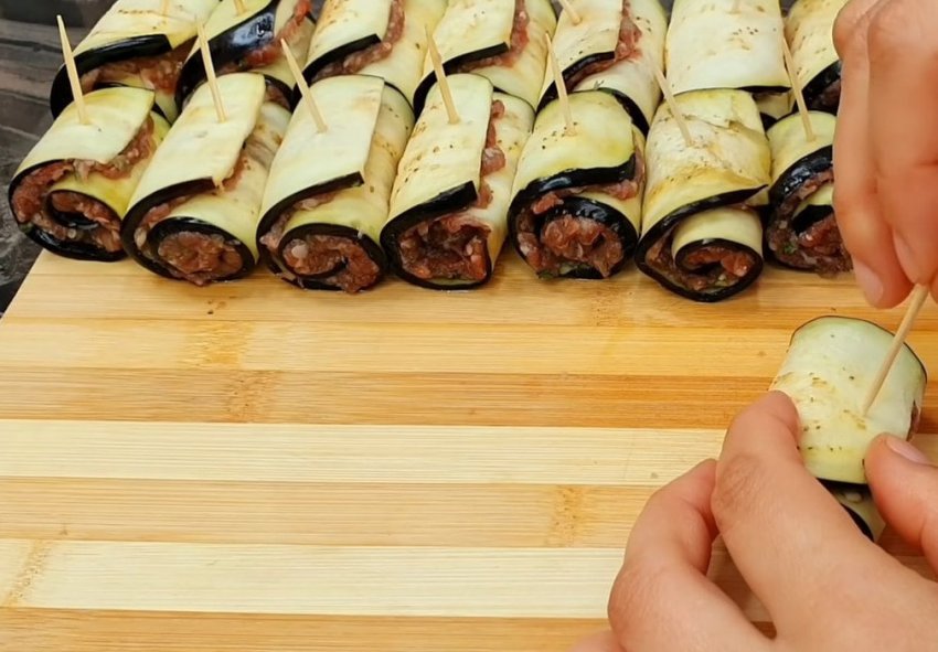 На каждый ломтик баклажана выложите начинку. Сформируйте рулетики и зафиксируйте их с помощью зубочисток.