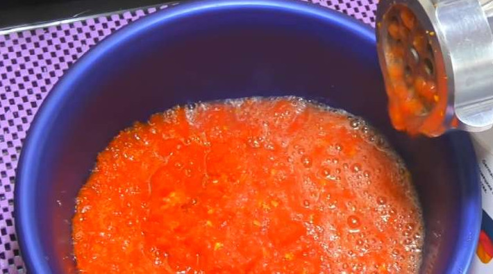 Сладкий перец и томаты пропустите через мясорубку. В эту смесь добавьте томатную пасту.