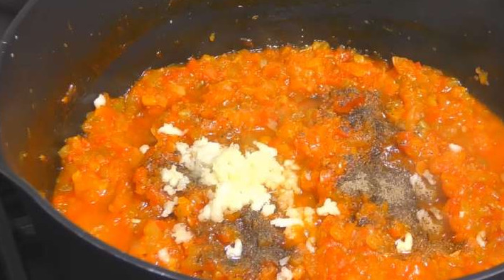 Затем влейте томатно-перечную заправку, добавьте соль и сахар. Тушите ещё 30 минут, пока густота не будет вас устраивать. За 5 минут до готовности добавьте чеснок, специи, уксус и тушите ещё 5 минут.