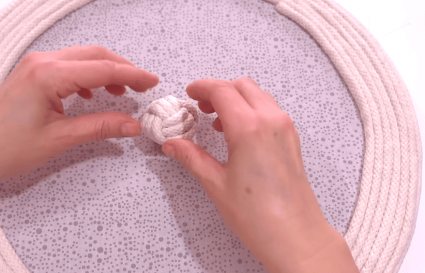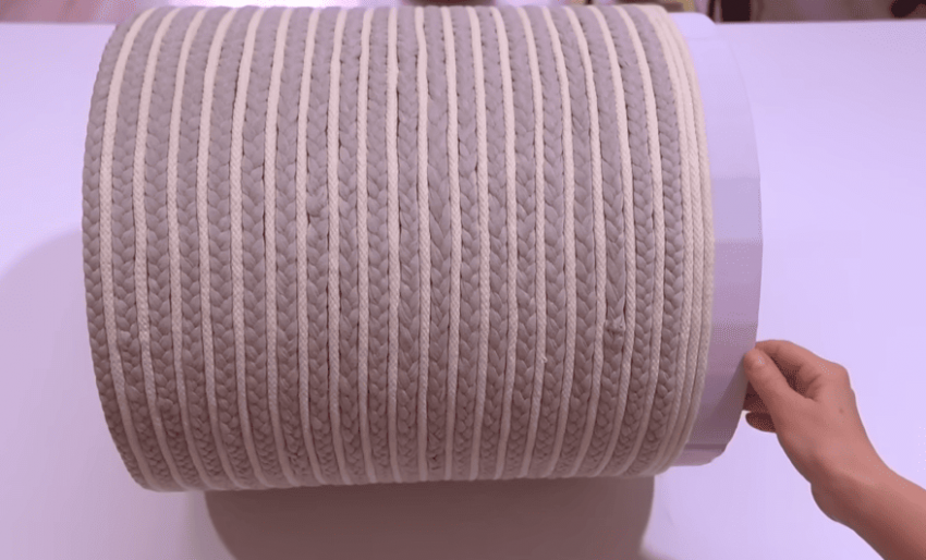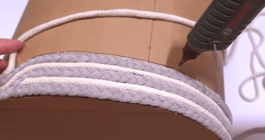 Чтобы получить более интересную фактуру, одновременно используем трикотажную косу и шнур. Оклейку начинаем с области донышка. Тщательно наносим клей по периметру и прокладываем косой нижний ряд. Параллельно, без отступа прокладываем следующий ряд, но уже веревочный.
