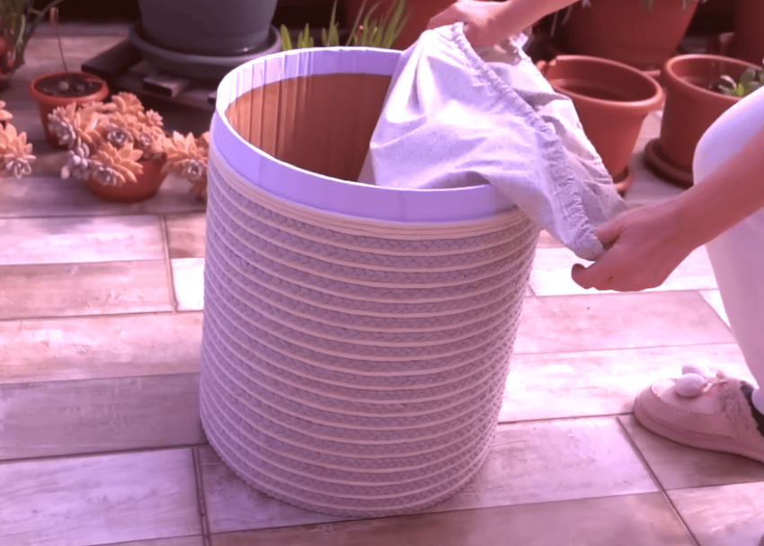 Из остатков подходящей ткани формируем внутренний съемный чехол. Готовый чехол помещаем внутрь корзины и расправляем.