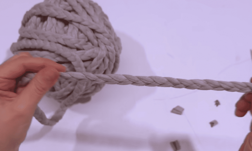Нарезаем трикотаж на длинные полосы ориентировочной шириной 5-6 см. Чтобы получить «трубочки», каждую полосу растягиваем, просто потянув за противоположные концы. Для удобства скрепляем концы 3-х трубочек между собой и фиксируем на рабочей поверхности удобным способом. Сплетаем полосы в косу. По мере необходимости наращиваем полосы. Для этого расправляем концы трубочек, совмещаем ткань с небольшим запасом и дополнительно прошиваем, а затем снова растягиваем, чтобы придать округлую форму.