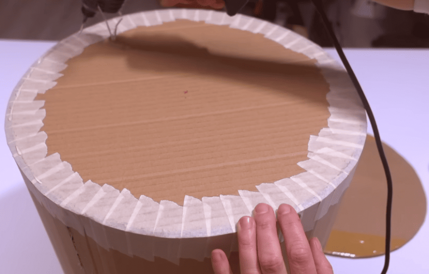 Вырезаем из картона 3 круглых заготовки. Вместо шаблона можно использовать основу. 2 заготовки станут донышком. Приклеиваем к основе первую заготовку, затем дополнительно проклеиваем место стыков по периметру молярным скотчем. После приклеиваем еще одну заготовку.