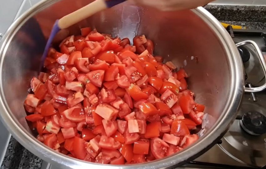 Крупно нарежьте лук и чеснок и обжарьте на растительном масле до румяного состояния. Добавьте к луку нарезанные крупным кубиком спелые помидоры, накройте крышкой и тушите 7-10 минут.