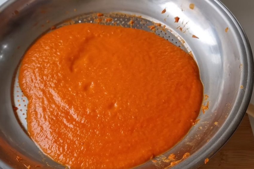 Процедите массу, чтобы убрать всю мякоть и крупные кусочки овощей.