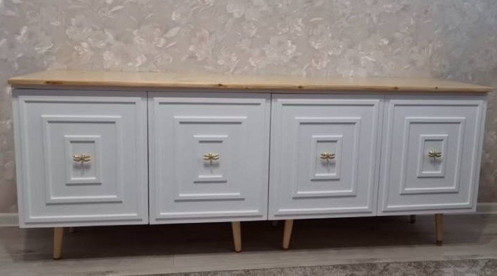 Старую советскую стенку, которая слишком массивная и совершенно не вписывается в современный интерьер, было решено переделать под стильную, современную тумбу под ТВ. Получилось прилично сэкономить на покупке новой мебель, и результат превзошёл все ожидания! Natalia Gureeva/youtube Верхние антресоли сняли, а с тумб открутили ручки и убрали старый декор. Natalia Gureeva/youtube Всю поверхность зашлифовали наждачкой, дверцы сняли. На них на жидкие гвозди прикрепили рейки 2 см толщиной, как показано на фото ниже, в виде трёх рам. Natalia Gureeva/youtube Сами тумбы поставили на новые высокие деревянные ножки. Внутрь установили полки от старых антресолей. Natalia Gureeva/youtube Все маленькие щели и неровности закрыли штукатуркой. Снова зашлифовали после высыхания. Natalia Gureeva/youtube Наконец, всю конструкцию покрасили в несколько слоёв с промежуточной просушкой. Natalia Gureeva/youtube Из мебельного щита сделали столешницу, покрыли лаком, зафиксировали на тумбах. Тумбы между собой также закрепили на болты. Вернули дверцы на место. Natalia Gureeva/youtube Финальный штрих — установили новые ручки в виде бабочек. Согласитесь, в обновлённом виде тумба выглядит совершенно иначе! Теперь это новый, стильный элемент интерьера. Natalia Gureeva/youtube