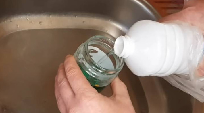 Наконец, если засор сильный, то в банке смешайте жидкое моющее средство (около 2 ст. л.). И примерно 100 мл белизны.