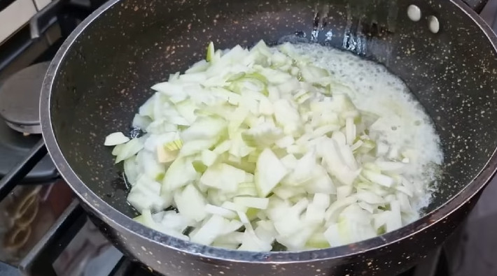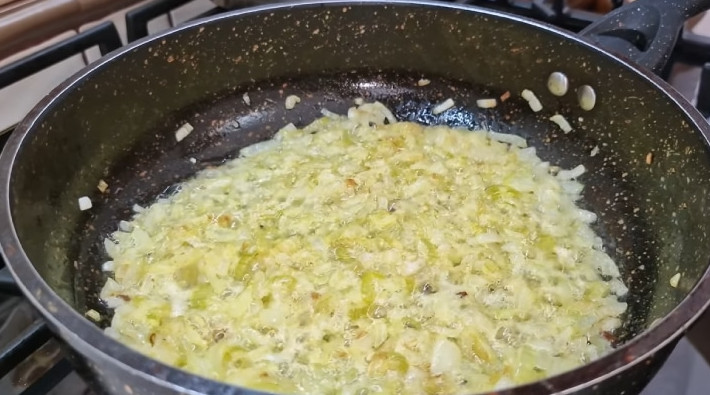 Добавьте соль по вкусу и соду — на кончике чайной ложки. Сода поможет луку быстрее приготовиться, сделает его прозрачным. На вкус это никак не влияет. Уменьшите огонь, потушите лук до прозрачности.