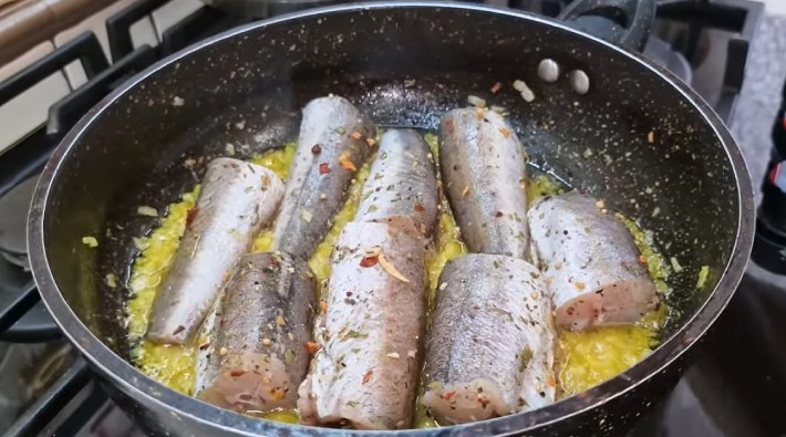 Когда лук будет мягким, прозрачным, выложите порезанную присоленную рыбку (например, минтай). Накройте крышкой, готовьте на огне чуть ниже среднего 10 минут.
