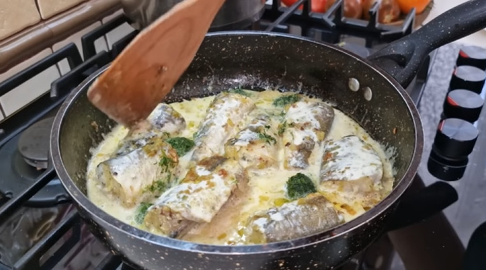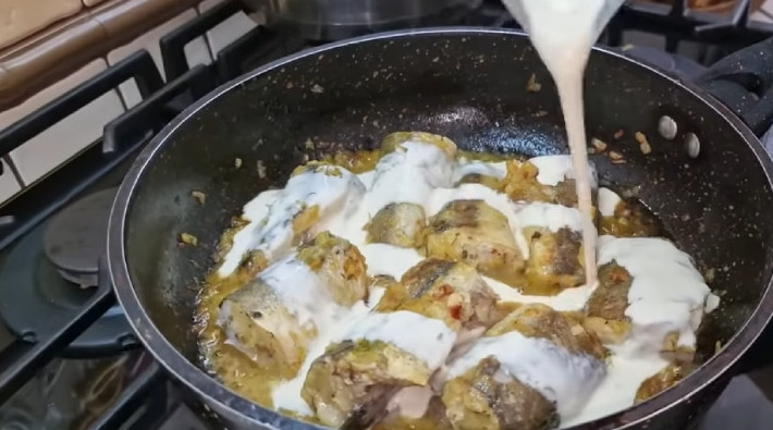 Затем переверните рыбу и влейте сметану/сливки. Накройте крышкой и томите ещё 15-20 минут.
