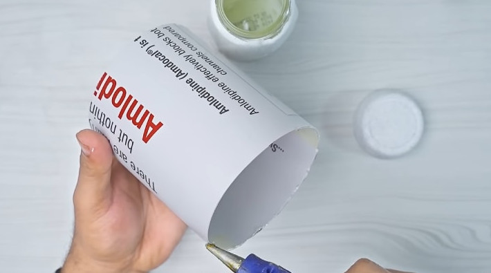 Удалите этикетку со стеклянной банки. Покрасьте акриловой краской в белый цвет. Из тонкого картона сверните цилиндр, склейте края скотчем. Приклейте низ цилиндра к ещё одному кусочку картона.
