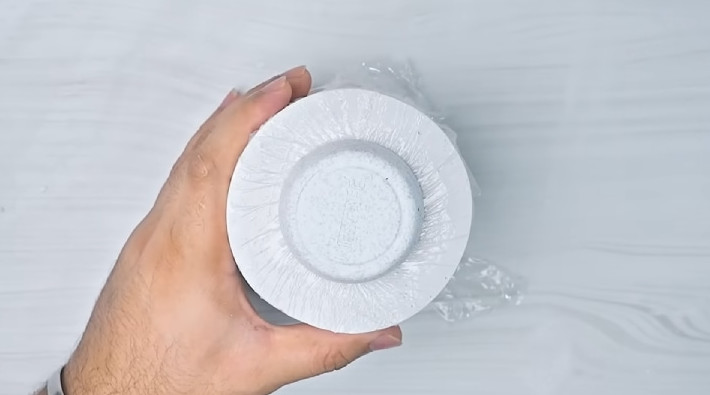 Через 4 часа удалите картон. Подровняйте края поделки, удалите лишний гипс с цементом, чтобы форма была ближе к овалу. Верх открытой банки в гипсе с цементом укройте пищевой плёнкой.