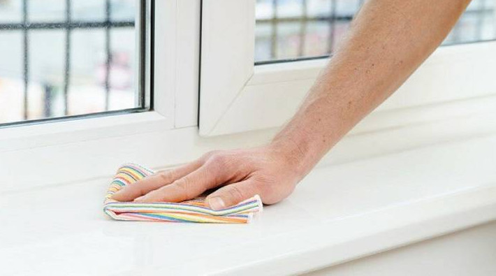 Подоконник помыть, обезжирить и высушить. Сверху наклеить двусторонний скотч. Снять защитную плёнку и сверху приклеить подложку.