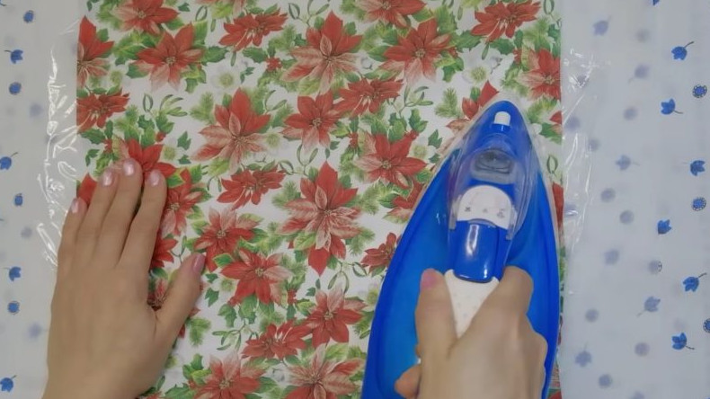 Аккуратно отделите верхний цветной слой салфетки и прогладьте его утюгом.