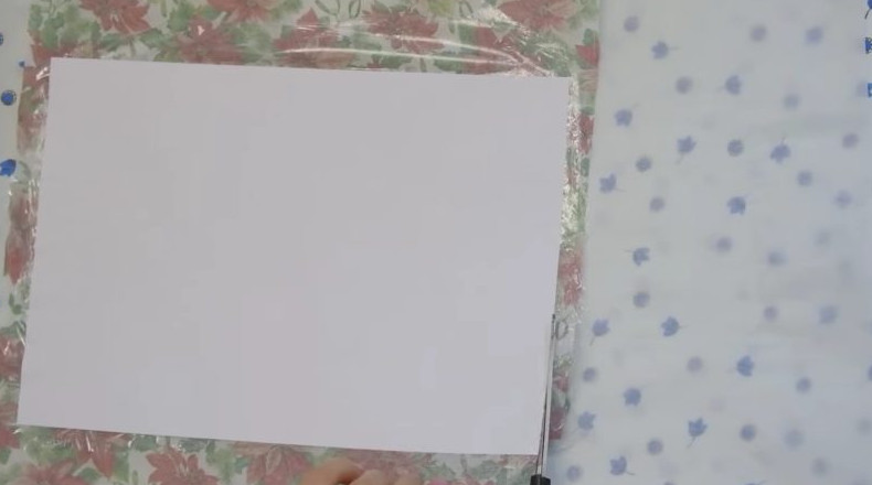 Лист формата А4 накройте пищевой пленкой, сверху положите подготовленную бумажную салфетку. Обрежьте пищевую пленку, оставляя по 2 см с каждой стороны. Тщательно прогладьте заготовку.