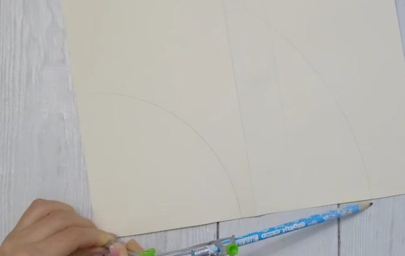 Подготовим шаблон для изготовления абажуров. Для этого на листе плотного картона нарисуйте четверть круга диаметром 12 см. Затем из той же точки начертите еще четверть круга диаметром 22,5 см.