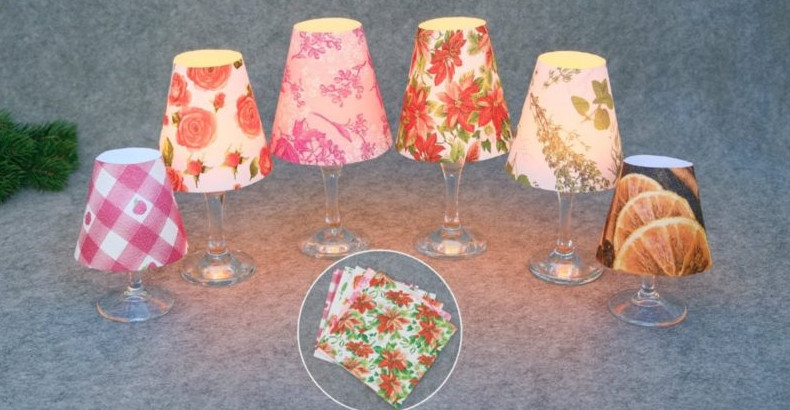 Поместите в бокал электрическую свечу и наденьте сверху декоративный абажур. Такой очаровательный светильник станет прекрасным украшением праздничного стола. А если взять для работы салфетки с новогодней тематикой, то такие лампы можно использовать в качестве декора дома на новый год.