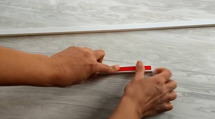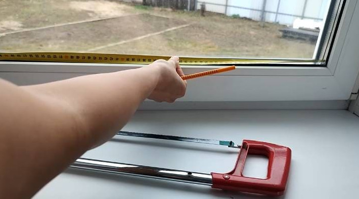 Пилой распилите кабель-канал на детали по размеру окна. Приклейте несколько кусочков двухстороннего скотча на одну сторону кабеля.