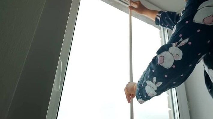 На оконной раме сделайте ровно по центру сверху и снизу пометки карандашом. Снимите верхний слой со скотча на кабель-канале и приклейте на окно.
