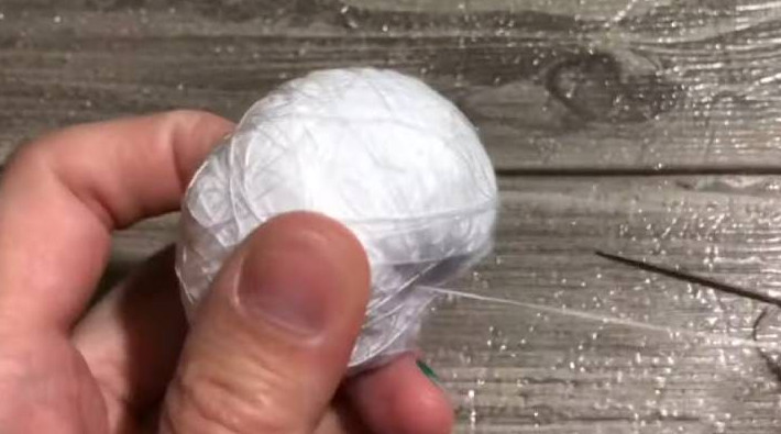 Смажьте поверхность шарика клейстером. Возьмите льняную вату и оберните ею шарик. Сверху добавьте ещё немного клейстера, чтобы сгладить поверхность.