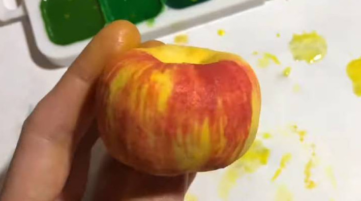 Покрасьте поделку акварельными красками. Старайтесь сымитировать цвета яблока.