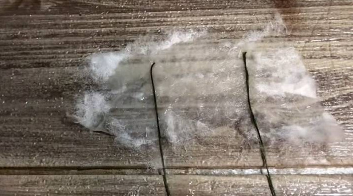 Кусок льняной ваты смочите клейстером, положите на рабочую поверхность. Сверху — два куска проволоки. Закройте вторым куском ваты с клейстером.