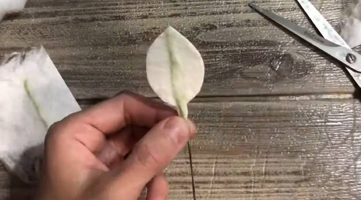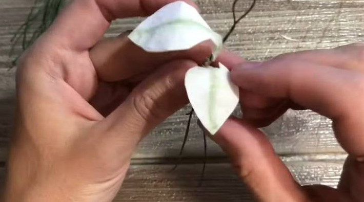 Добавьте третью проволоку, сверните край в петельку. Прикрутите два листика. Перекрутите низ проволоки. Закройте его той же ватой, смоченной в клейстере.