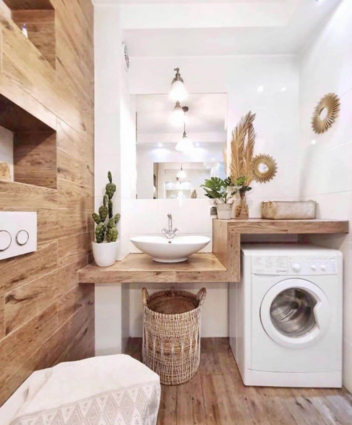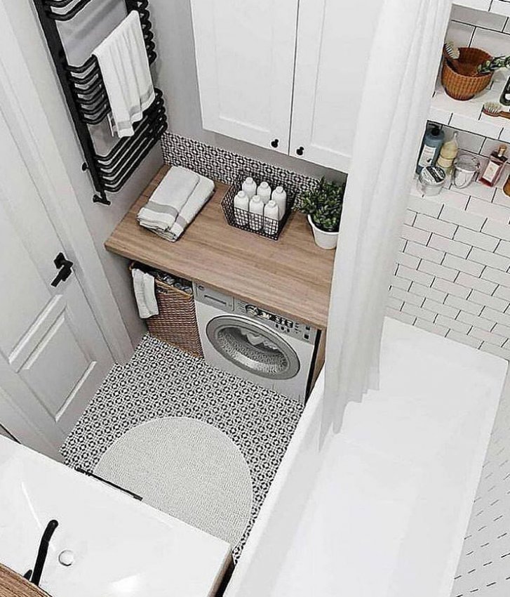 Найти место для стиральной машины в маленькой квартире — та еще задача. Конечно, оптимальное решение — разместить стиральную машину в ванной. Да, даже в крошечном санузле можно найти место под довольно крупную бытовую технику. В этом случае нужно грамотно подойти к выбору мебели.