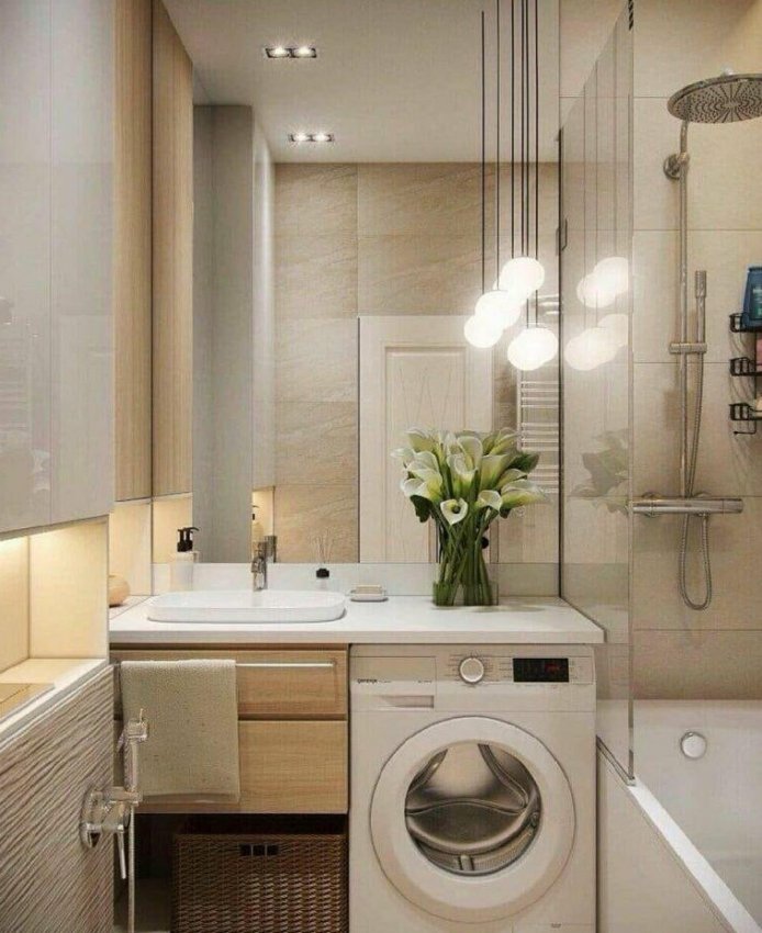 Самое компактное расположение стиральной машины в маленькой ванной — под специальной накладной для раковины, подвод к коммуникациям у которой находится у стены за стиральной машиной. Такое решение позволит максимально грамотно использовать имеющееся пространство.