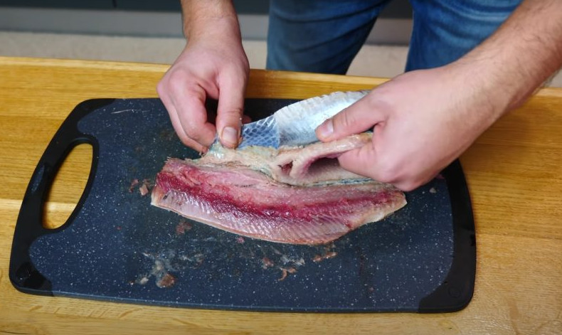 Для начала надо почистить селедку. У сельди без головы удалите хребет и все кости. Зачистите пленку, и обрежьте края. Отделите филе от кожи.