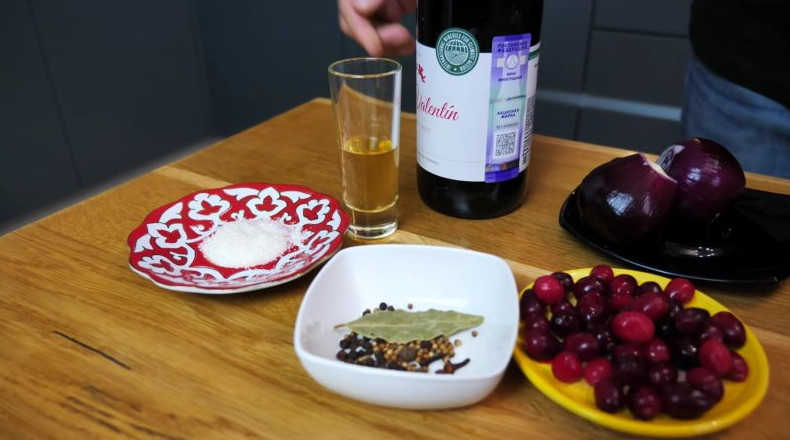 Для приготовления первого маринада налейте в сотейник красное сухое вино, яблочный уксус, добавьте специи, клюкву и проварите ингредиенты 5 минут. Оставьте маринад остывать до комнатной температуры.