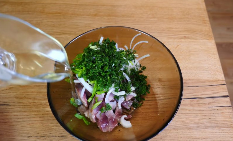 К нарезанной сельди добавьте репчатый лук, нарезанный полукольцами, измельченный зеленый лук, укроп и растительное масло.
