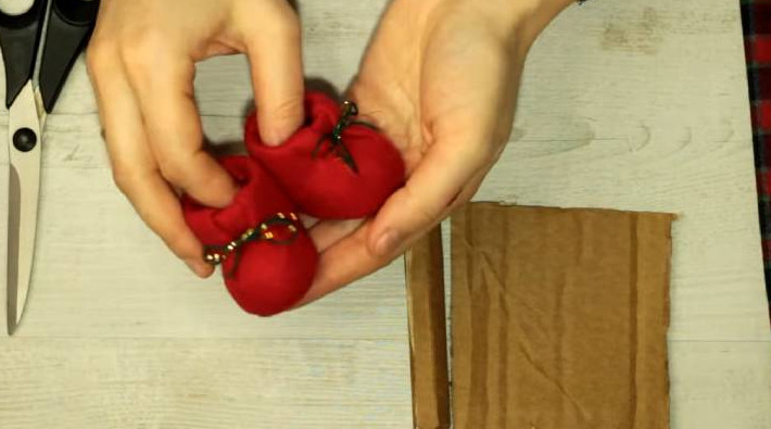 Для ножек отрежьте 10 см гофрокартона, сверните в трубочку. Оклейте со всех сторон фетром.