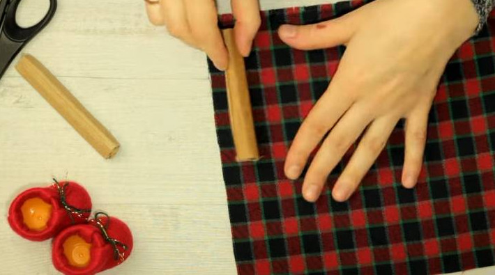 Оберните ботиночки фетром и приклейте. Проткните ткань иглой по центру, проденьте декоративную тесьму, завяжите.