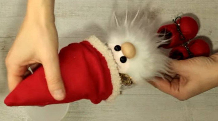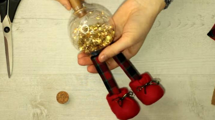 Вклейте ножки в ботиночки. В качестве туловища используйте ёлочный шар — приклейте его к ножкам гномика.