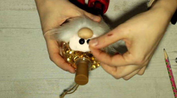 Внутрь ёлочного шара поместите гирлянду. Из колготок или носков сделайте носик с помощью любого наполнителя, приклейте. Следующим шагом вырежьте бороду из меховой ткани, также приклейте. Наконец, из воздушного пластилина раскатайте кусочек, прилепите на шар, сверху — полубусины для глаз.