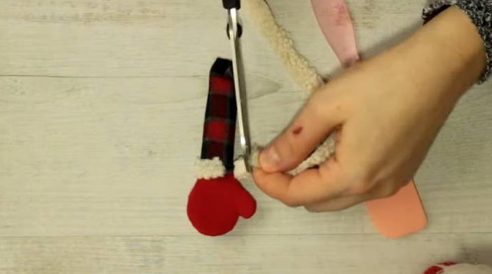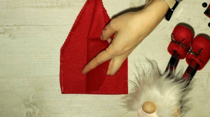Украсьте край меховой тканью. Приклейте к голове гномика только спереди, чтобы сзади оставался доступ к гирлянде.
