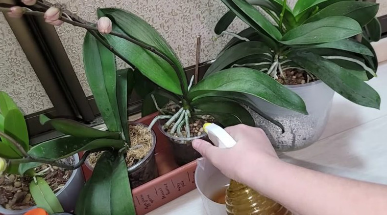 Понять, что орхидея нуждается в поливе помогут корни растения. Если кони стали светлыми — пора поливать растение.