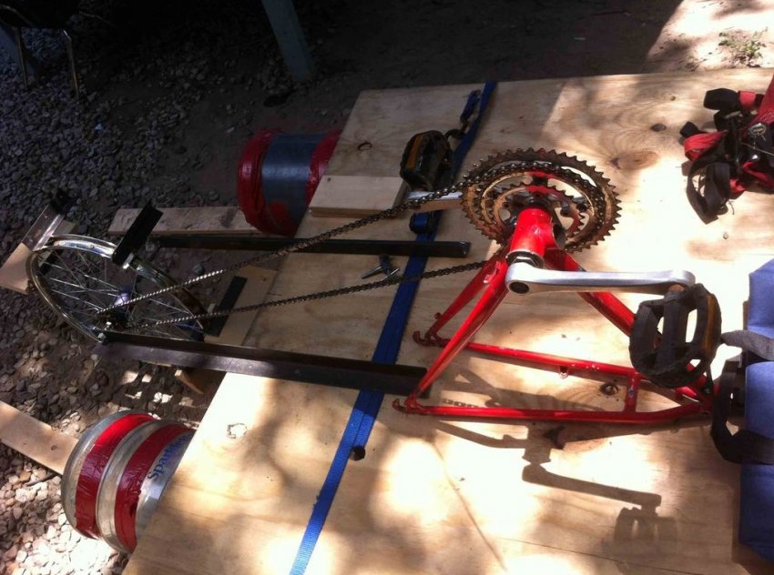 Далее к получившейся конструкции крепится часть велосипедной рамы с педалями и на металлических уголках велосипедное колесо.