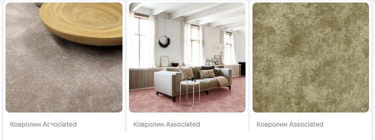 В ассортименте представлены ковролины с разнообразными узорами, а также однотонные покрытия в светлых, серых и насыщенных оттенках — фиолетовом, красном, зелёном и других.