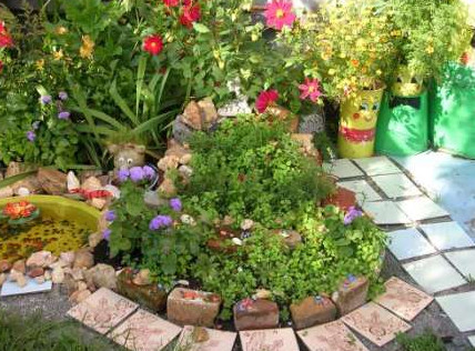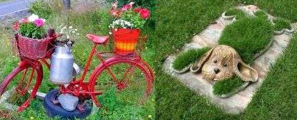 Чтобы выбрать идею, можно просмотреть в интернете уже существующую идеи, взять на заметку что-то интересное и начать творить. В качестве материалов может выступать то, что осталось после ремонта – доски, краски, кирпич, камни, гипс и т.д. Допустим, в доме валяется куча ненужных, старых бутылок. Почему бы не сделать из этого подручного материала фигурки? Например, каких-то зверьков, которые радуют детей. Сруб дерева можно превратить в кормушку для птиц, чтобы каждое утро к вашему окну доносились приятные песни множества птичек.