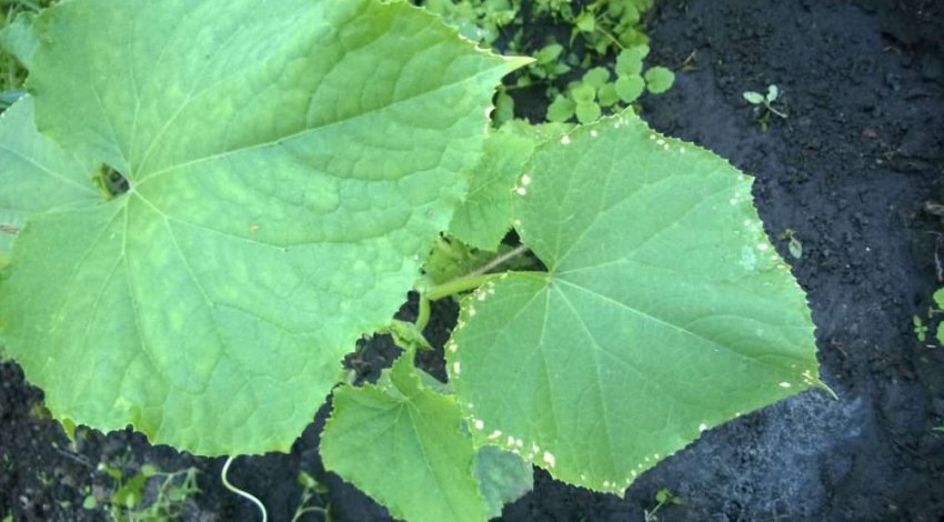 Пероноспороз. В связи с перепадами температуры на листьях огурцов образуется обильная роса. Влажность на листьях провоцирует развитие пероноспороза ложной мучнистой росы. На листе образуются пятнышки, которые особенно хорошо видны по утрам. Они маслянисто-желтоватые, и чем их больше, тем быстрее лист пожелтеет и погибнет. Если не бороться с этим явлением, то погибнет ботва огурца.