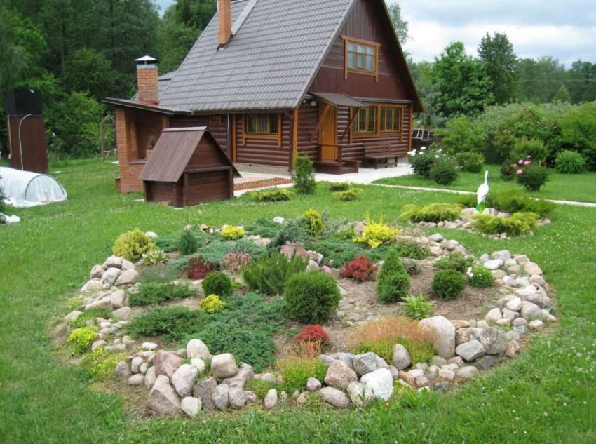 Некоторые дачники недалеко от входа сооружают интересные ландшафтные фигуры, к примеру, можно высадить можжевельник, по периметру которого будут расти цветы, сорта которых нужно подобрать с таким учетом. Чтобы они цвели в течение всего дачного сезона.